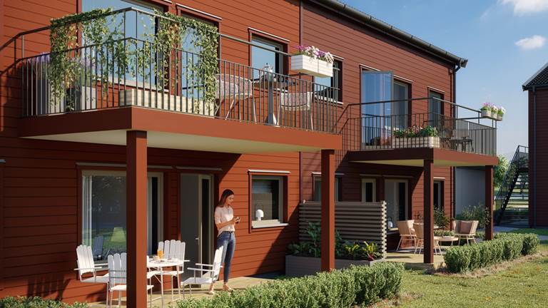 Bostäderna byggs som lägenheter med 3–5 rum och kök, där du bor bekvämt på ett plan antingen med markläge eller en trappa upp. Alla lägenheter har balkong eller uteplats. Golv i ekparkett, ljusa väggfärger och stora fönster med generöst ljusinsläpp ger ett luftigt hem fullt med energi.
