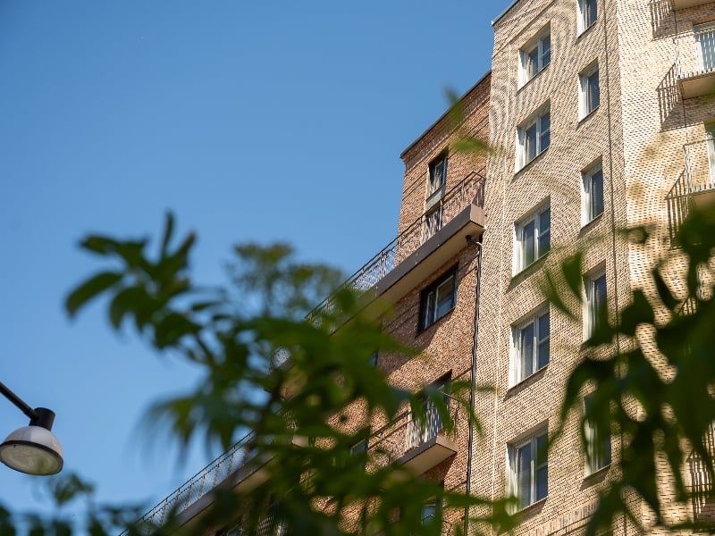 Bostaden har genomgående vitpigmenterade lamellparkettgolv, vitmålade väggar, fönsterbänkar i natursten och vita släta innerdörrar.
