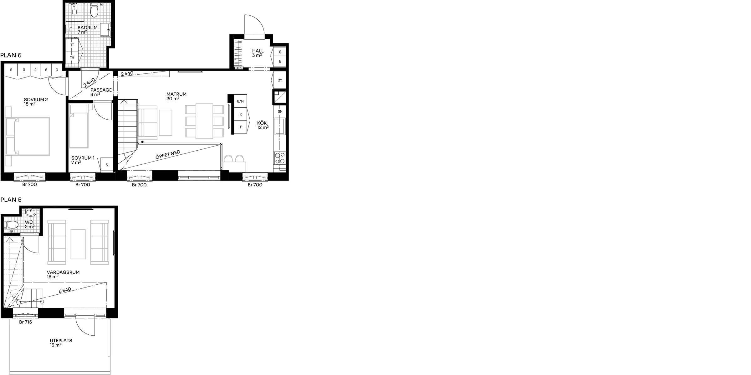 En trappa ned finns vardagsrummet, en avskild och ombonad del av hemmet med plats för soffgrupp och avkoppling. Härifrån nås även bostadens uteplats om ca 13 kvm – en härlig förlängning av vardagsrummet under årets varmare månader.