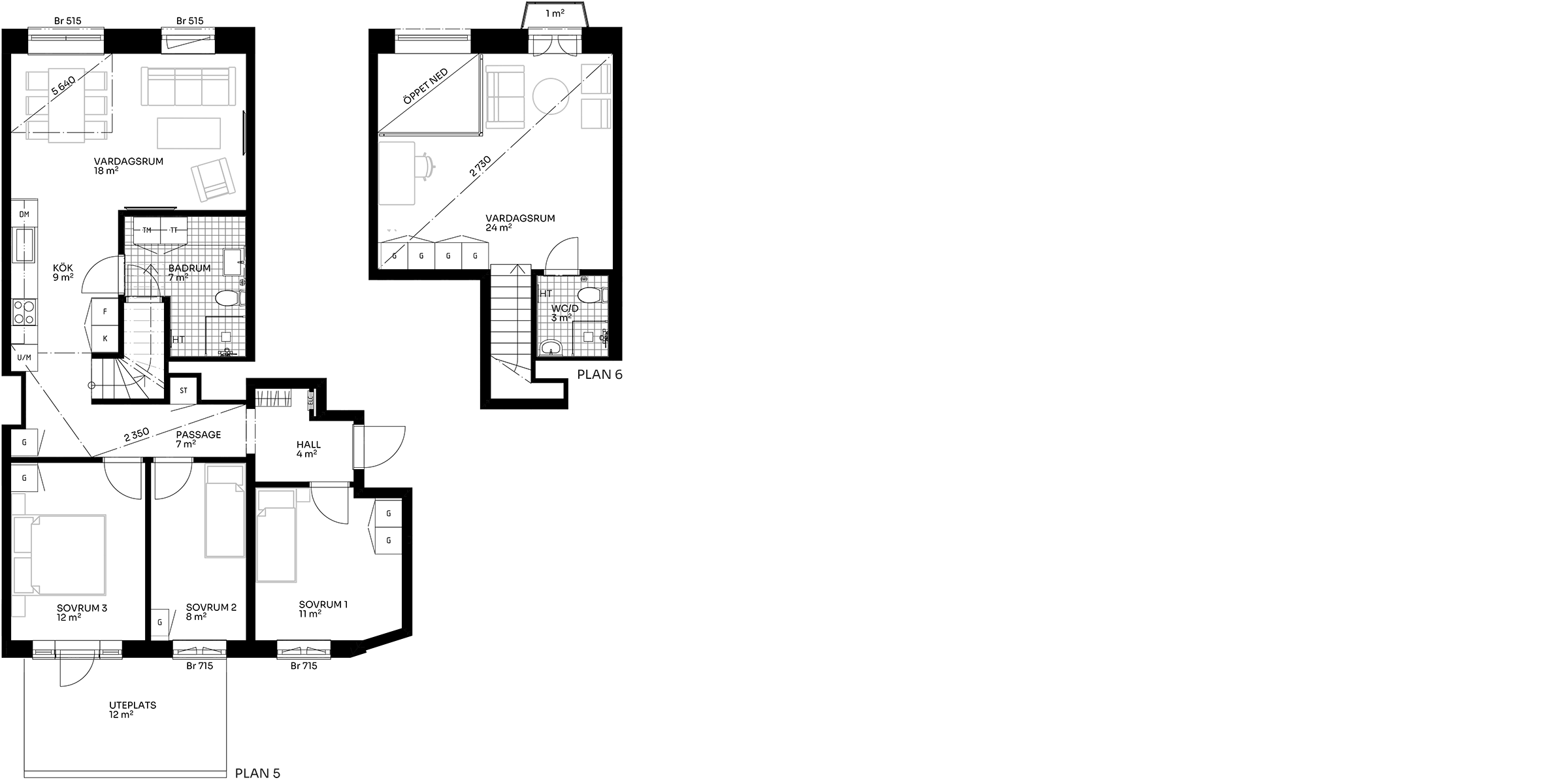 En trappa upp möts du av ytterligare ett vardagsrum om 24 kvm med öppet ner mot nedre plan, vilket skapar rymd och extra ljusinsläpp. På övre plan finns även en separat WC/dusch.