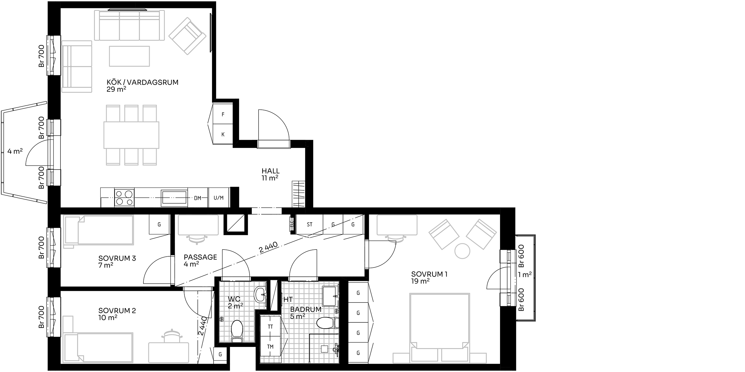 Denna ljusa och välplanerade fyrarummare om 93 kvm erbjuder ett hem där funktion, rymd och kvalitet möts i en genomtänkt helhet. Planlösningen är tydlig och lättmöblerad, med sociala ytor samlade i ena delen av bostaden och sovrummen mer avskilt placerade.