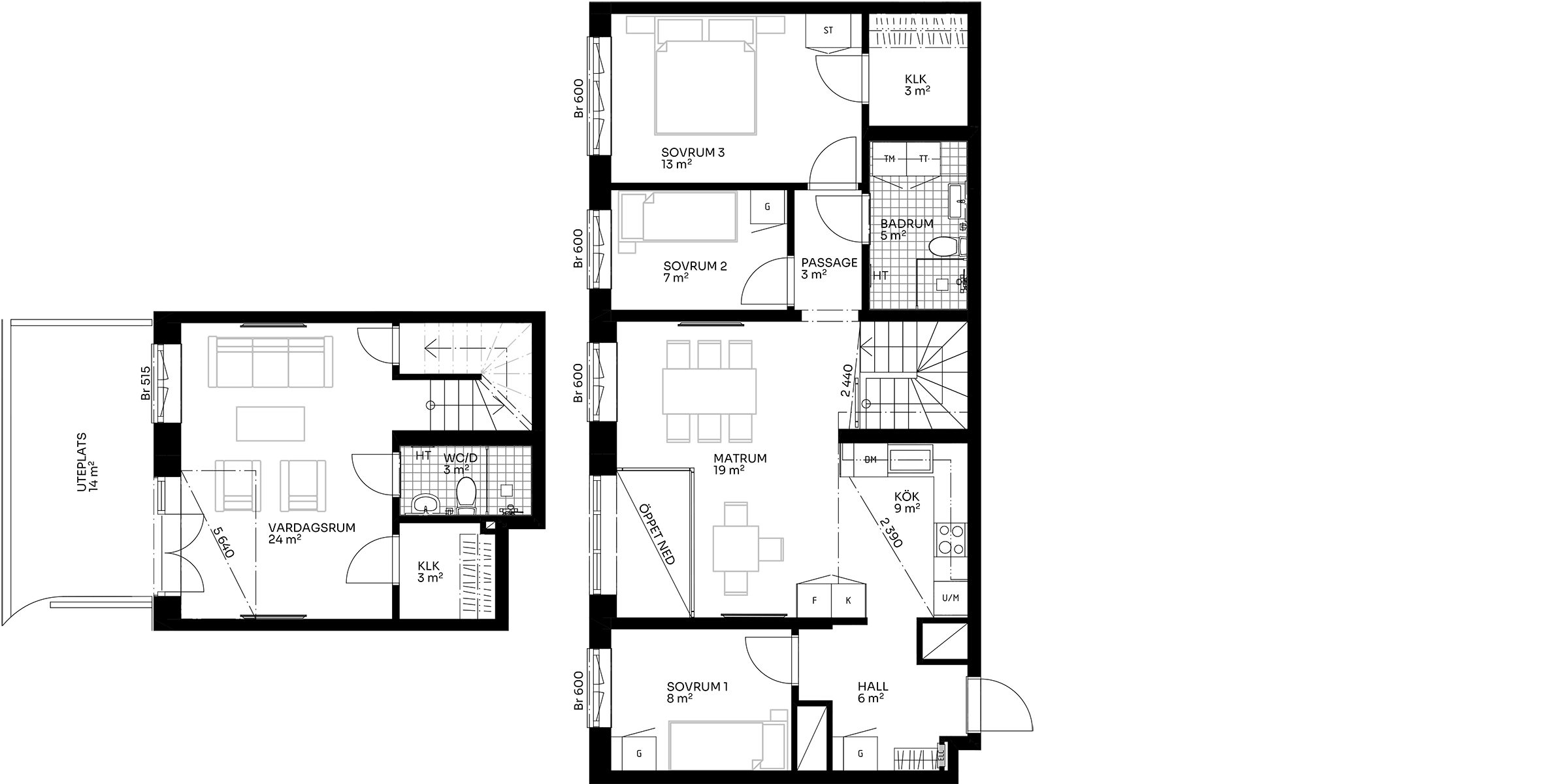 På entréplanet möts du av en välkomnande hall som leder vidare till kök och matplats. Köket är stilrent och modernt med påkostade materialval, full utrustning och gott om förvaring. Här intill ligger matplatsen med plats för det stora middagsbordet – en naturlig samlingspunkt för vardag och fest. På samma plan finns tre sovrum i olika storlekar, vilket gör bostaden flexibel för både familj, gäster och hemmakontor. Ett av rummen har dessutom tillgång till en praktisk klädkammare. Här finns även ett av bostadens två badrum, smakfullt inrett med moderna materialval och hög komfort.