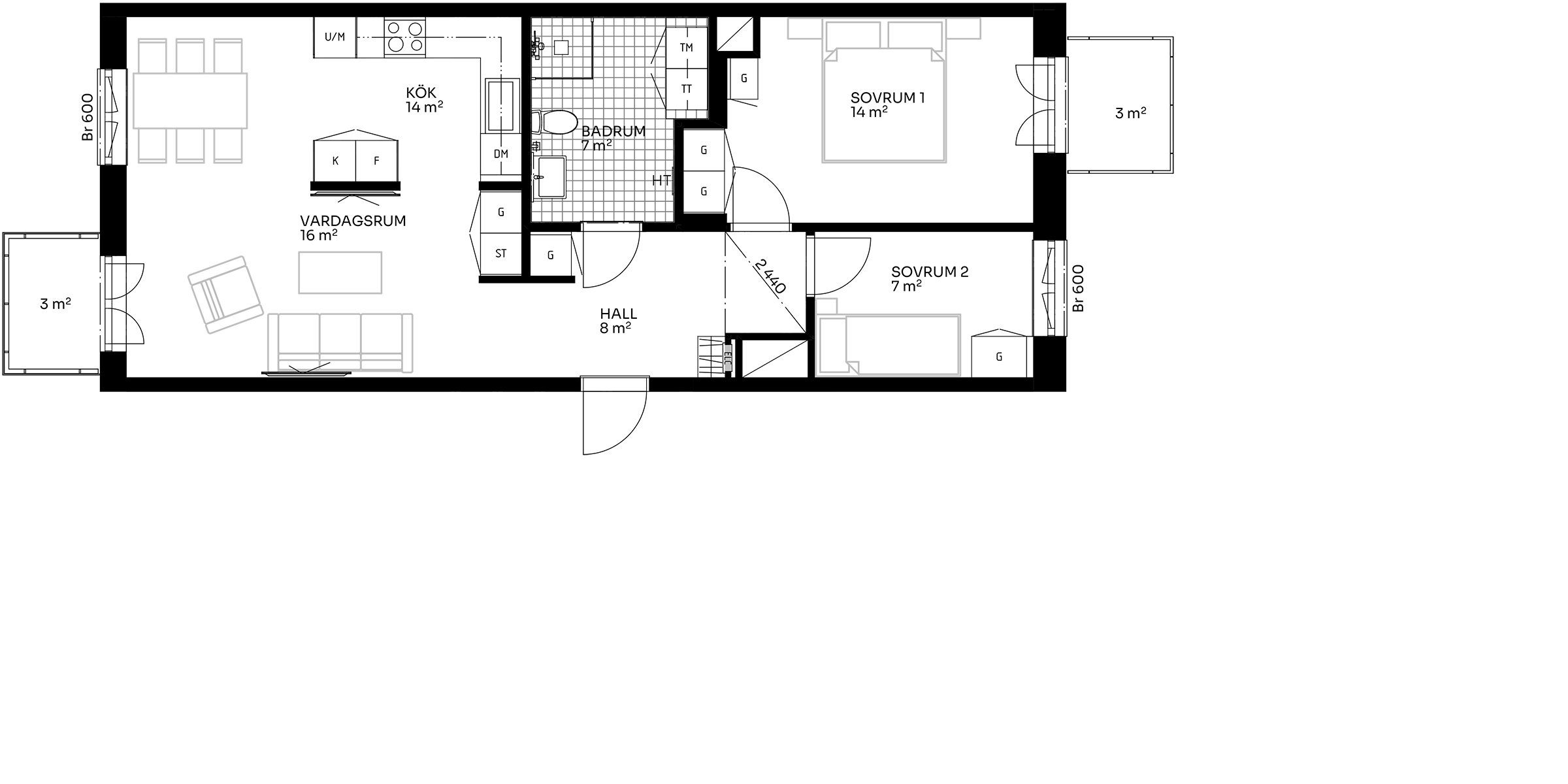 Kök och vardagsrum ligger i öppen anslutning med plats för både matbord och soffgrupp. Från vardagsrummet nås den ena balkongen och från det större sovrummet den andra, vilket ger möjlighet till både morgon- och kvällssol.