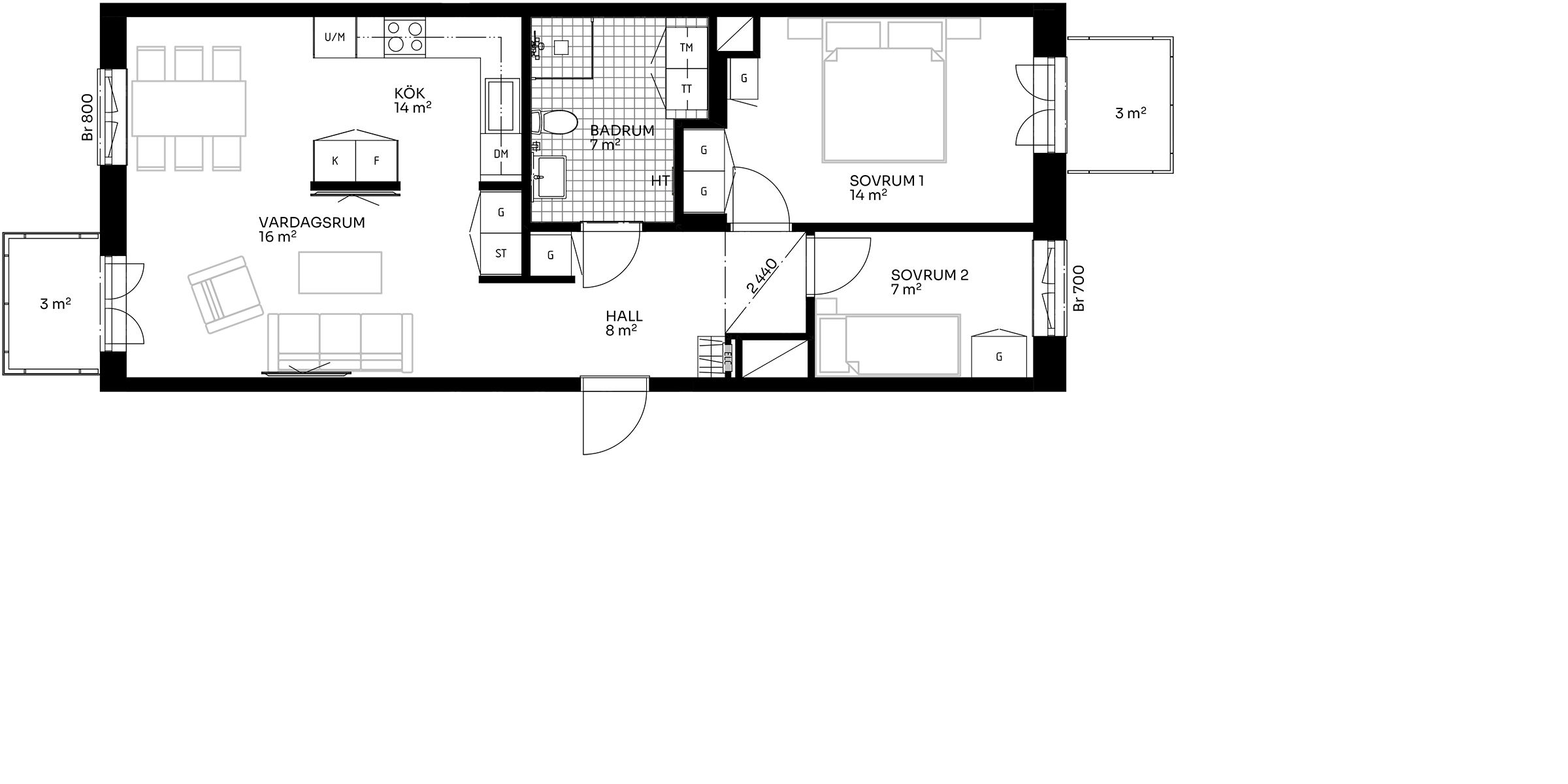 Kök och vardagsrum ligger i öppen anslutning med plats för både matbord och soffgrupp. Från vardagsrummet nås den ena balkongen och från det större sovrummet den andra, vilket ger möjlighet till både morgon- och kvällssol.