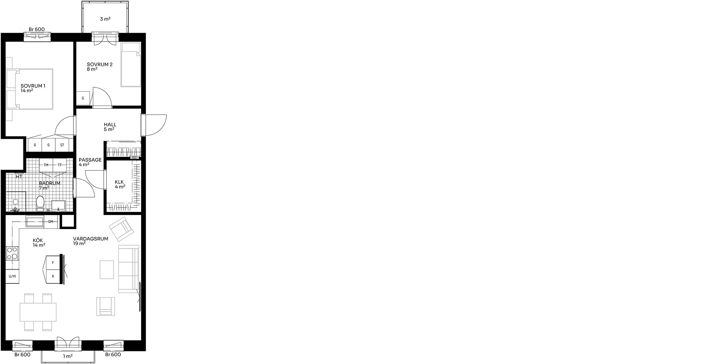 Kök och vardagsrum ligger i öppen anslutning med gott om plats för både matbord och soffgrupp. Från vardagsrummet nås en mindre balkong som ger extra ljus och möjlighet att öppna upp mot utsidan.