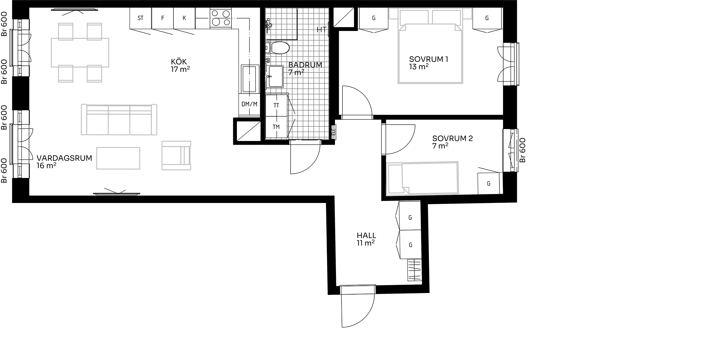 Bostaden erbjuder två bra sovrum med generösa förvaringsmöjligheter. Det större sovrummet har plats för dubbelsäng och garderober, medan det mindre fungerar perfekt som barnrum, gästrum eller hemmakontor.